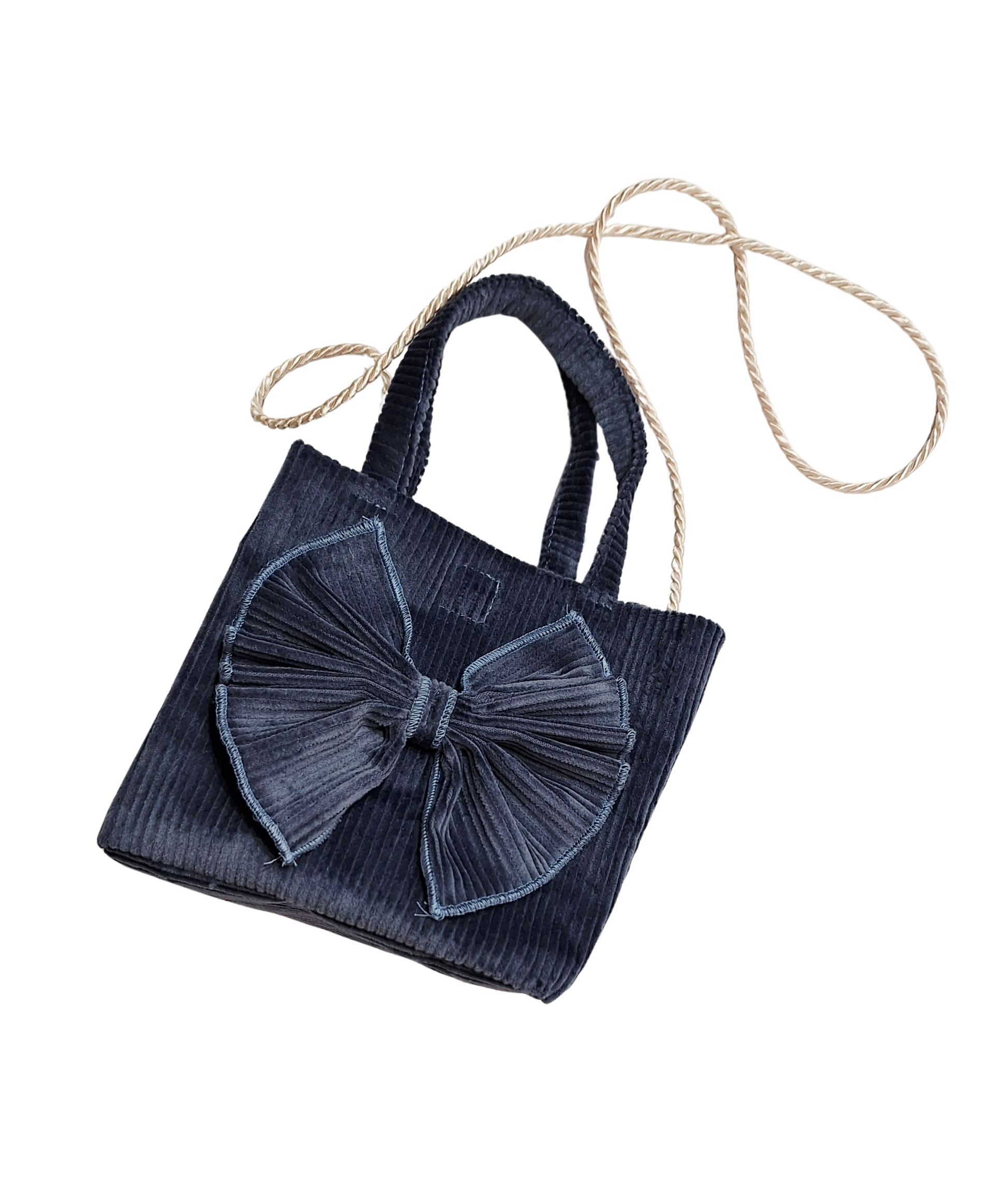 Taschen mit Henkel und langer Kordel zum Umhängen, große Schleife aus demselben Muster auf einer Seite.