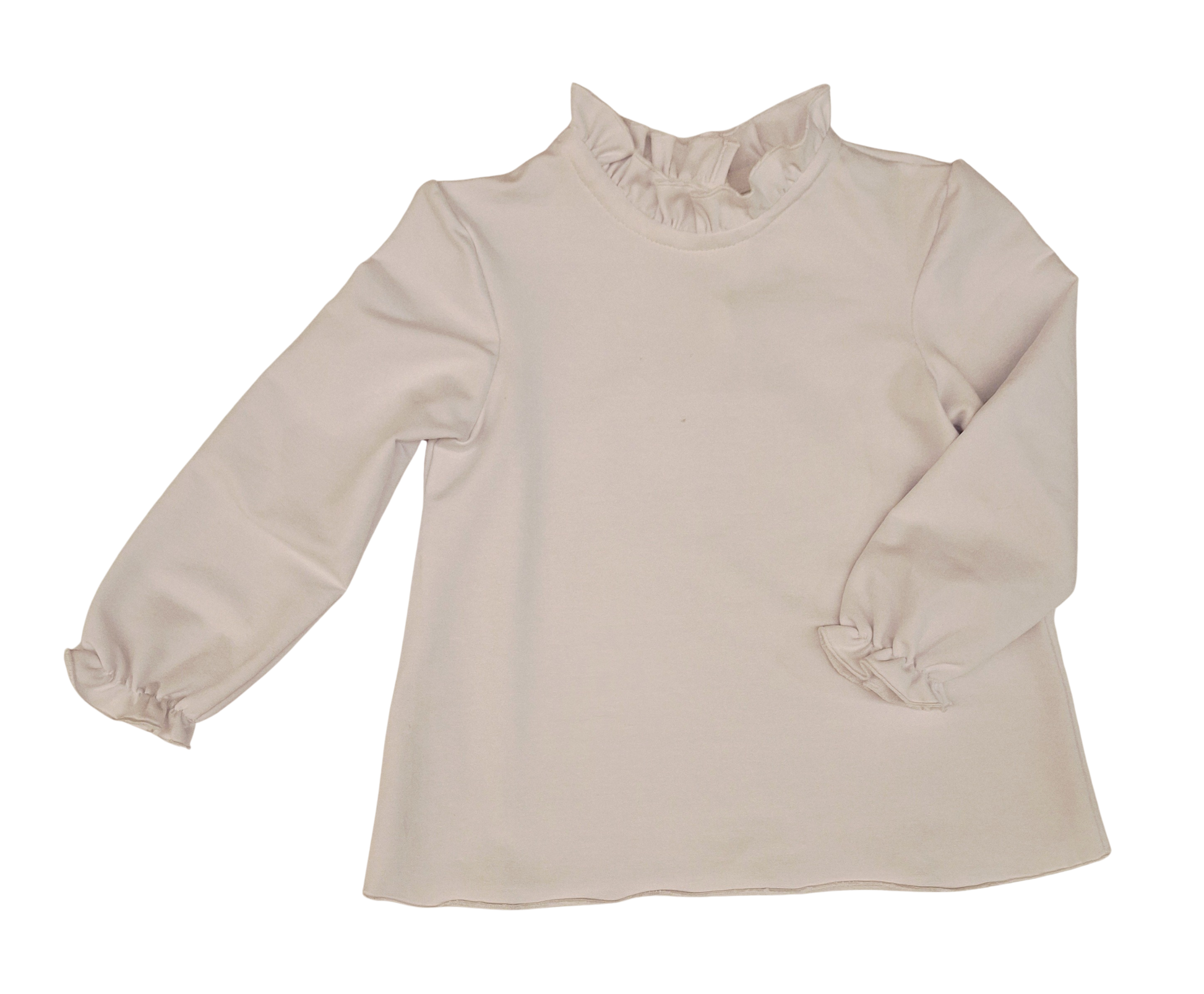 Shirt in Jersey mit Puffärmel und kleine Rüsche als Kragen, Druckknopf im Rückenteil.