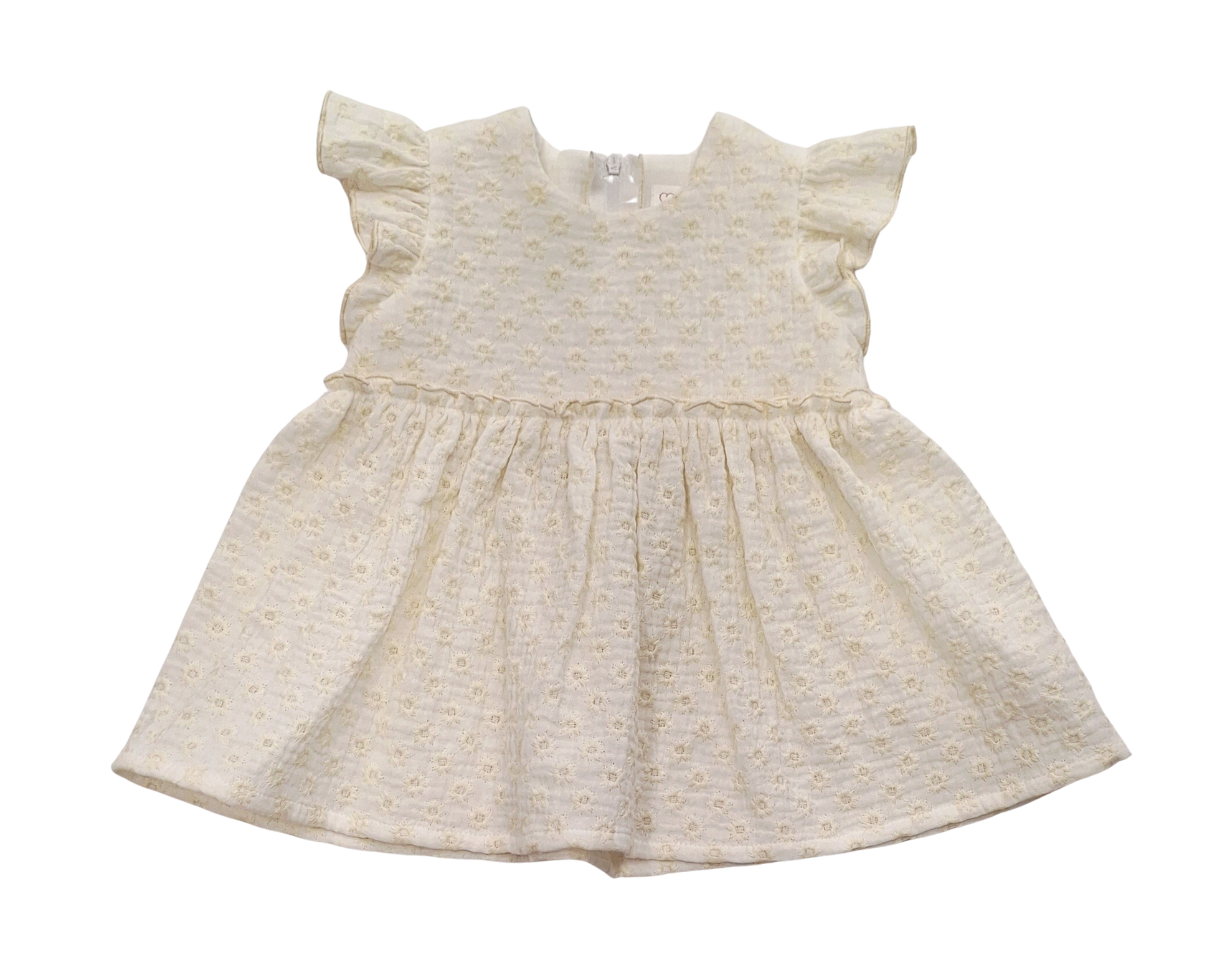 Kleid aus besticktem Musselin Stoff, leicht für den Sommer, Rundhals, Rüsche an der Schulter, aufgesetzter Rock gerüscht, Zipp im Rückenteil.